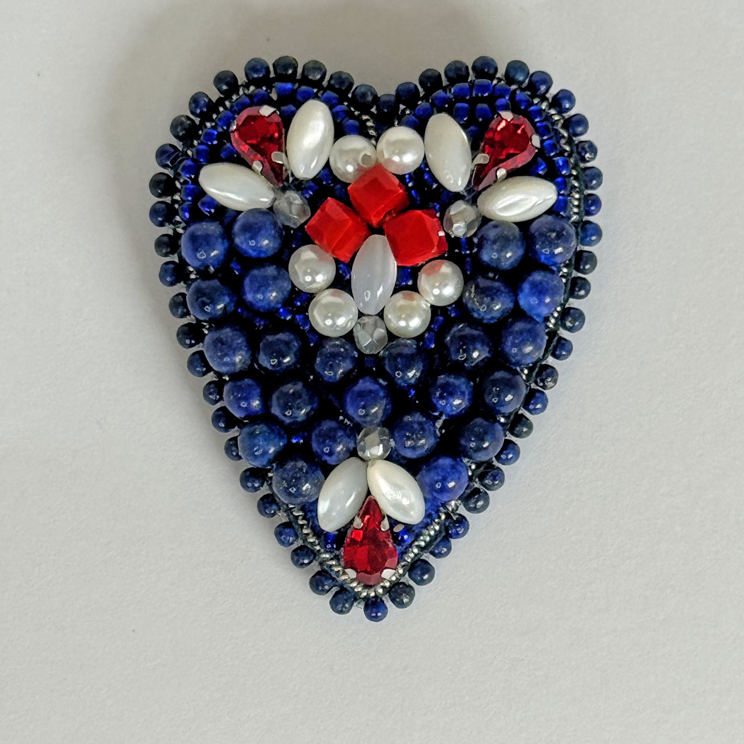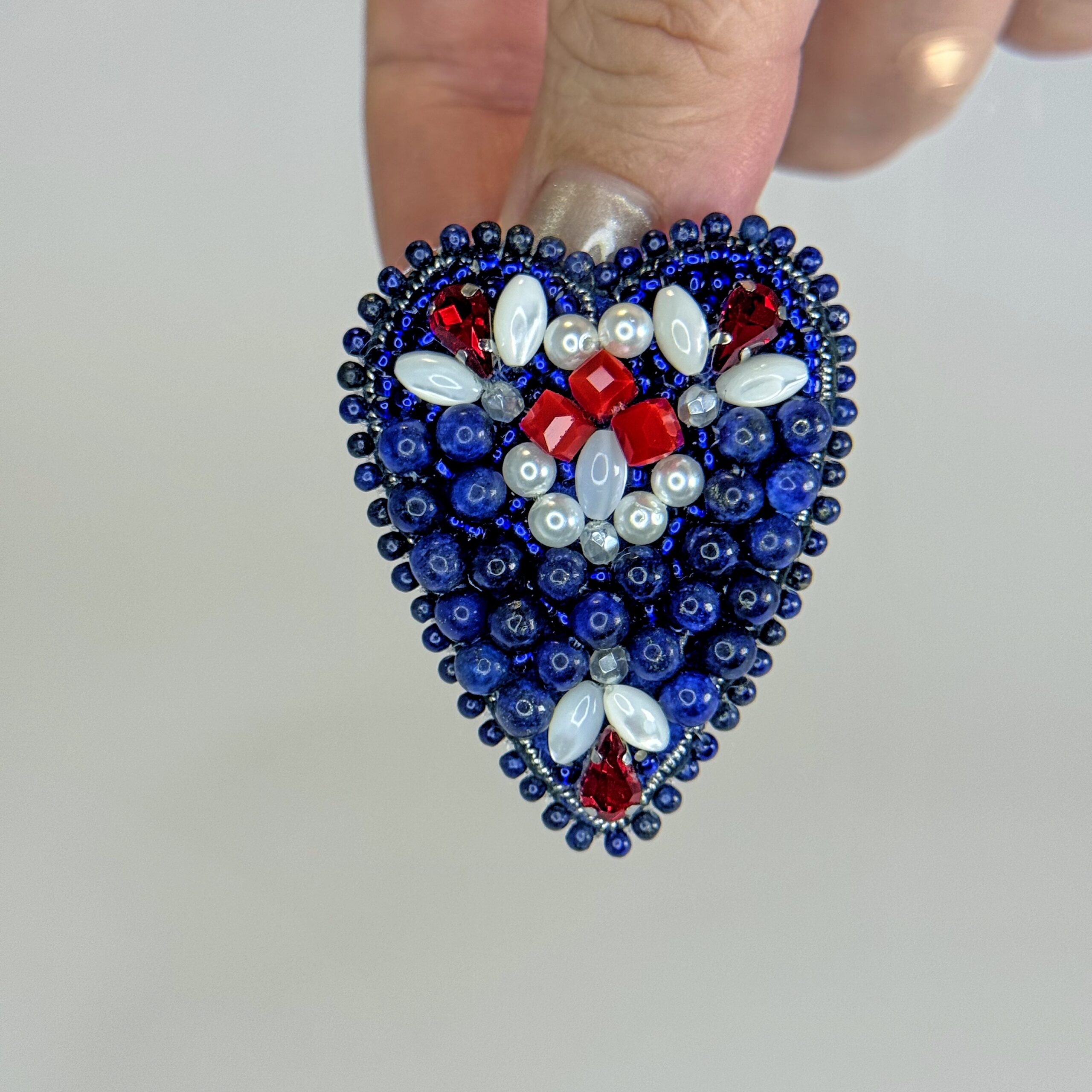 Lapis Lazuli Heart Brooch, Mother of Pearl Jewelry, Red Crystal Pin, Anniversary Gift for Her, Handmade Gemstone Heart, Blue and Red Brooch, Statement Artisan Pin — lifestyle photo