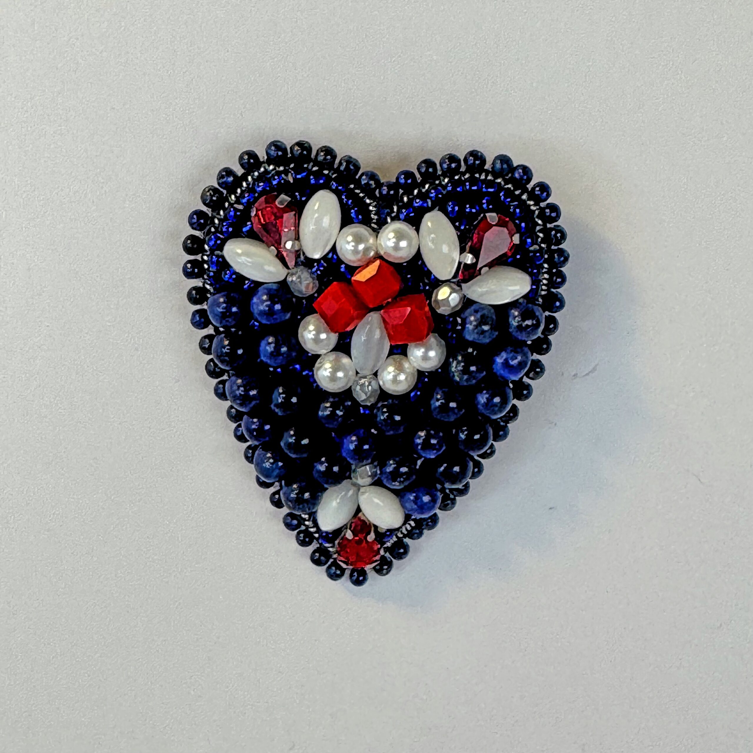 Lapis Lazuli Heart Brooch, Mother of Pearl Jewelry, Red Crystal Pin, Anniversary Gift for Her, Handmade Gemstone Heart, Blue and Red Brooch, Statement Artisan Pin