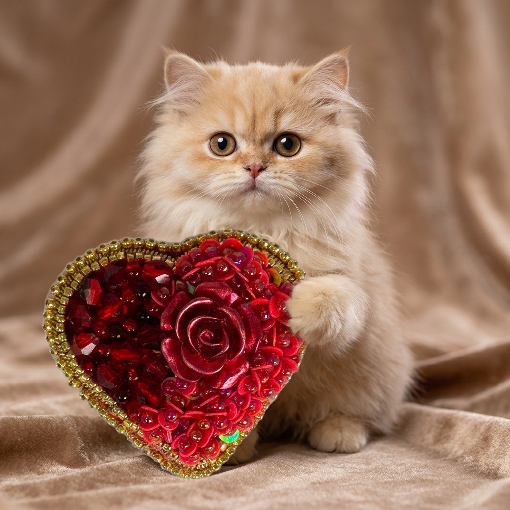 Drama, passion, and romance embodied in one extraordinary brooch — a large, three-dimensional red rose cabochon dominates the center of this deep red heart, surrounded by layers of shimmering red sequins that ripple across the surface. A border of warm gold seed beads frames the heart with golden luxury. The prominent 3D rose gives this piece exceptional visual depth and sculptural presence, making it the ultimate Valentine's Day statement.