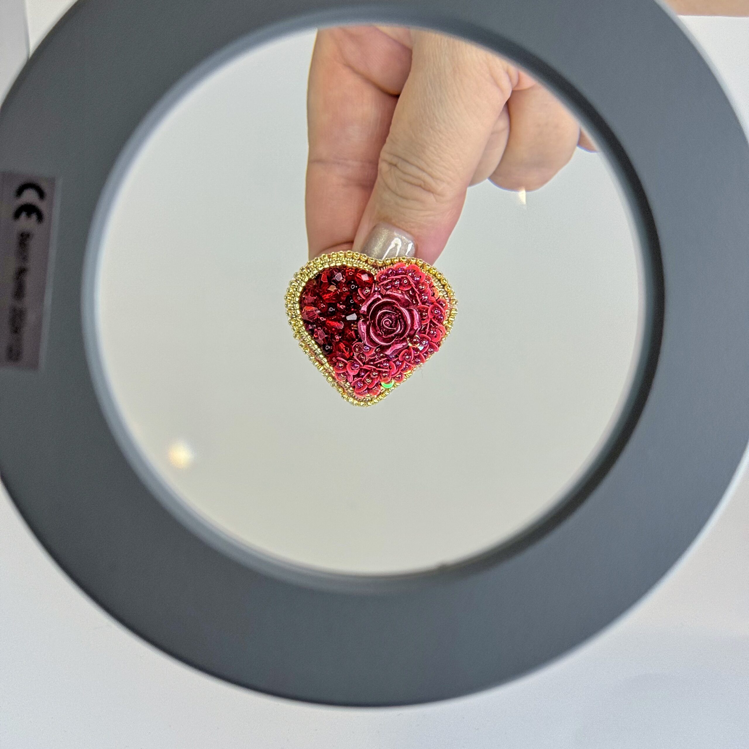 Red Rose Heart Brooch 3D Large, Beaded Heart Pin with Rose Cabochon Sequins, Handmade Romantic Valentine Jewelry — lifestyle photo
