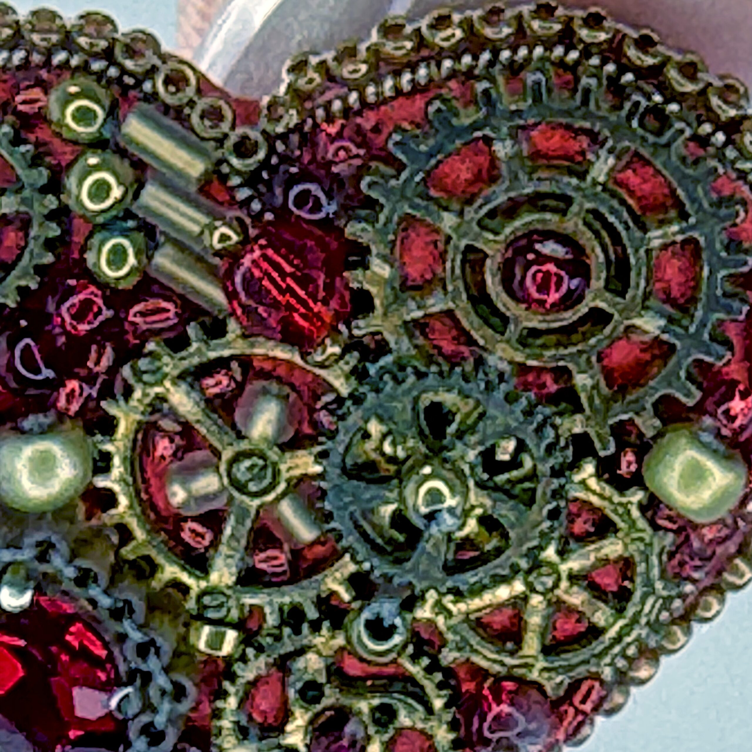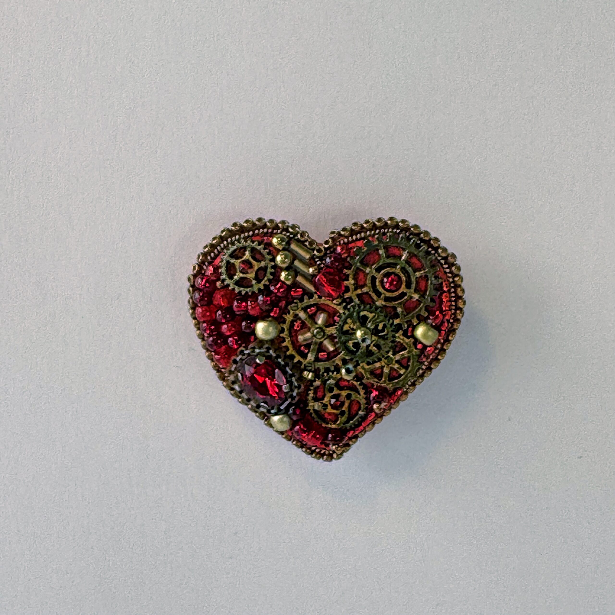 A bold mechanical heart for the boldest of romantics — this steampunk brooch features prominent bronze gears arranged in a clean, dramatic composition at the heart's center. The surrounding surface is filled with deep red glass beads, creating a rich crimson backdrop that makes the bronze clockwork machinery pop with industrial elegance. A cleaner, more focused gear arrangement than its counterpart makes this piece particularly striking and architecturally refined.